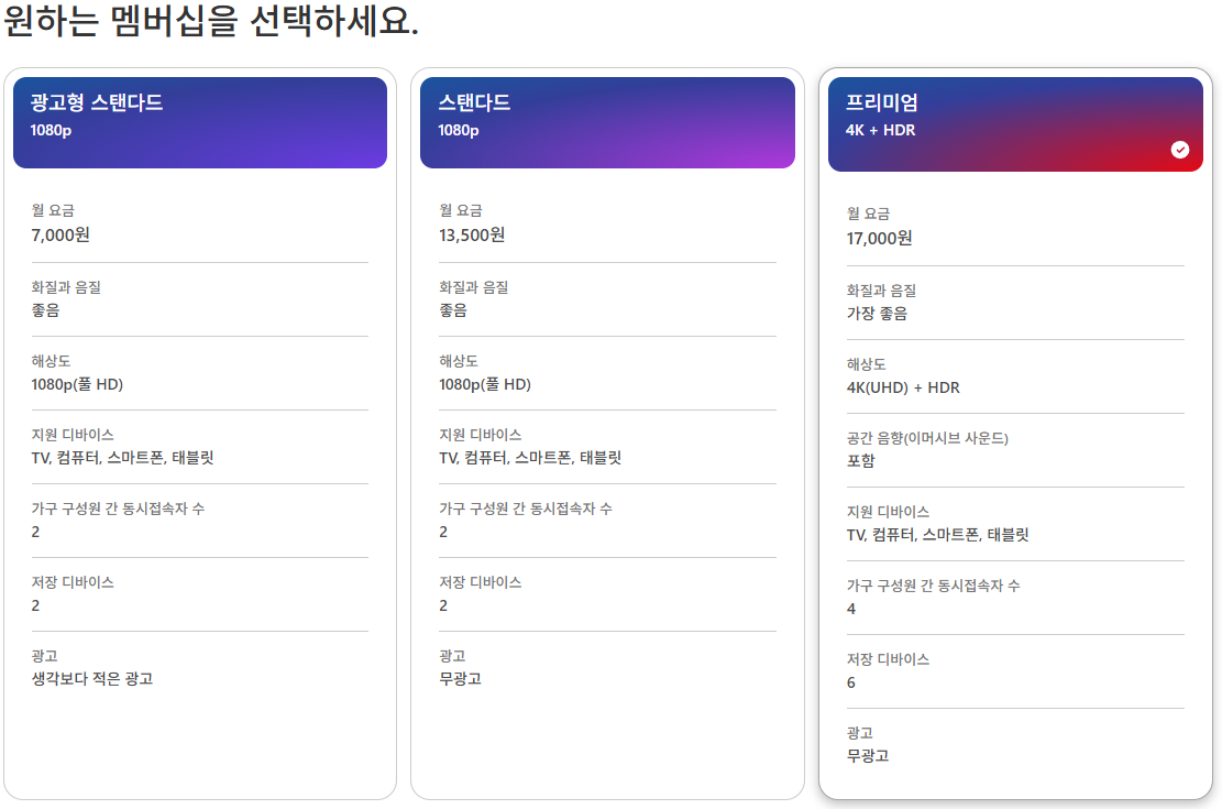 - 프리미엄 요금제: 광고 없음, 최고 화질인 4K(UHD) 지원, 동시 접속 기기 수도 4대까지 가능한 고급형 요금제입니다. 월 요금은 약 17,000원 선 입니다.