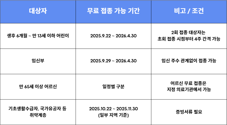 💡 주의: 무료 접종 대상과 일정은 지자체나 보건소마다 약간씩 다를 수 있으므로, 사전에 거주지 보건소 또는 예방접종 도우미 사이트에서 확인하는 것이 안전합니다.